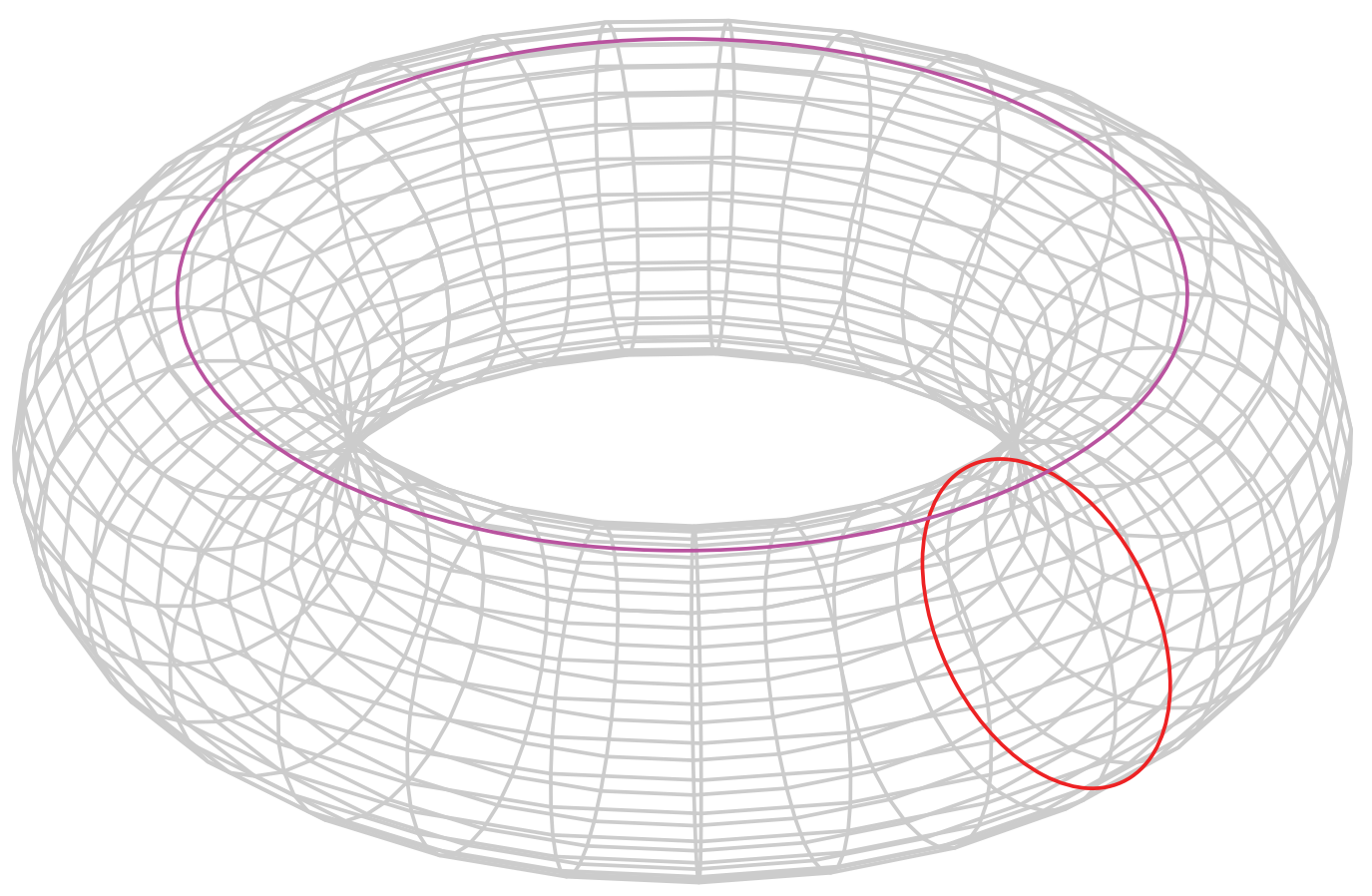 “What’s a 3-torus? A three-dimensional structure existing in a four-dimensional space. To understand what a 3-torus is, first think about a circle. A circle is a single dimensional object that wraps around to its beginning point as it reaches its end point. Any point on the circumference of a circle can be specified by a single number (by an angle from 0° to 360°), so a circle is one-dimensional. However, in order to draw a circle you need a two-dimensional space such as a piece of paper. So, a circle is a one-dimensional object existing in a two-dimensional space. Now, think about a doughnut (a torus, see picture below). You can make a donut if you extrude a circle into a cylinder and then bend the cylinder around so the top and bottom faces are touching. You can specify any point on the surface of the doughnut with just two numbers (an angle of the original circle and a position along the extruded cylinder), so the torus surface is two-dimensional and clearly exists in a threedimensional space. The next step is not as easy to visualize — imagine you took a donut and extruded it through a fourth dimension, and then connected the beginning to the end. This is a 3-torus. It’s a three-dimensional object that exists in a four-dimensional space. If you happened to be on the surface of a 3-torus and you looked far enough in any direction you’d see the back of your own head! If you walked far enough in any direction you’d end up exactly where you started, facing the same direction. The same is true for these wavetables: if you navigate far enough in any direction, you end up back to where you started.”