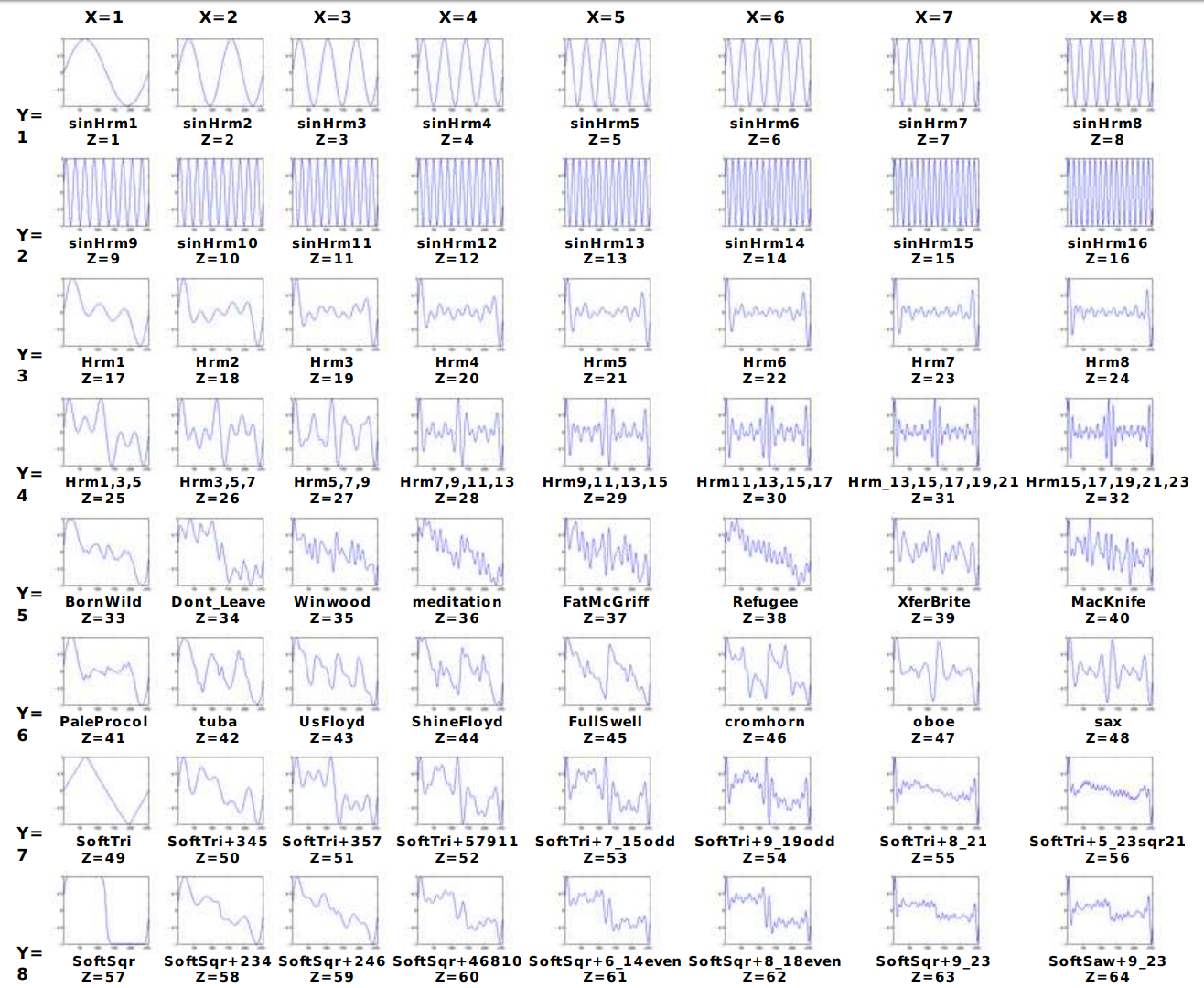 Each index of 64 waves was arranged as an 8x8 array. The “rows” are represented on the X axis and the “columns” on the Y axis (pictured above). The third array (Z index) adds depth to the X,Y array. In this étude this lookup table is modulated with various sources including curvilinear shapes and smoothed bipolar Brownian motion. As the modulation source indexes through the positions in the table a smoothing function for “frame interpolation” has been applied to the waves. This smoothing/anti-aliasing algorithm allows the two outputs to be a continuous blending of one wave to another. During these iterations the algorithms’ calculation adds an order of magnitude of “in-between” waveforms, so that the 192 waveforms are expanded to over 24,000 possible timbres. In these studies no filtration was applied to avoid masking the timbral shifting generating the rich partial series.